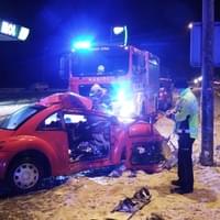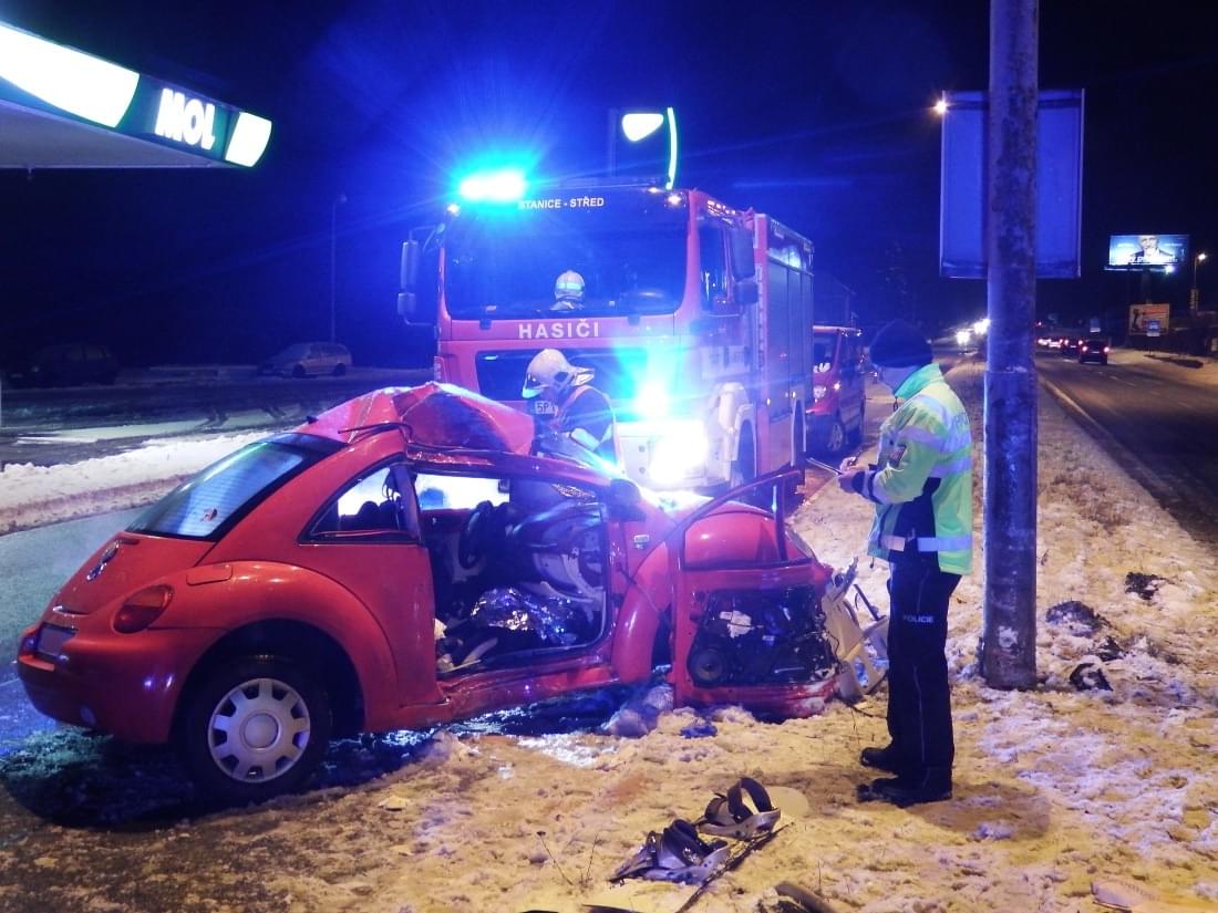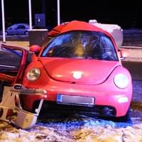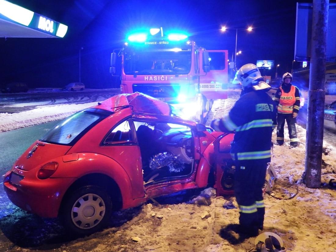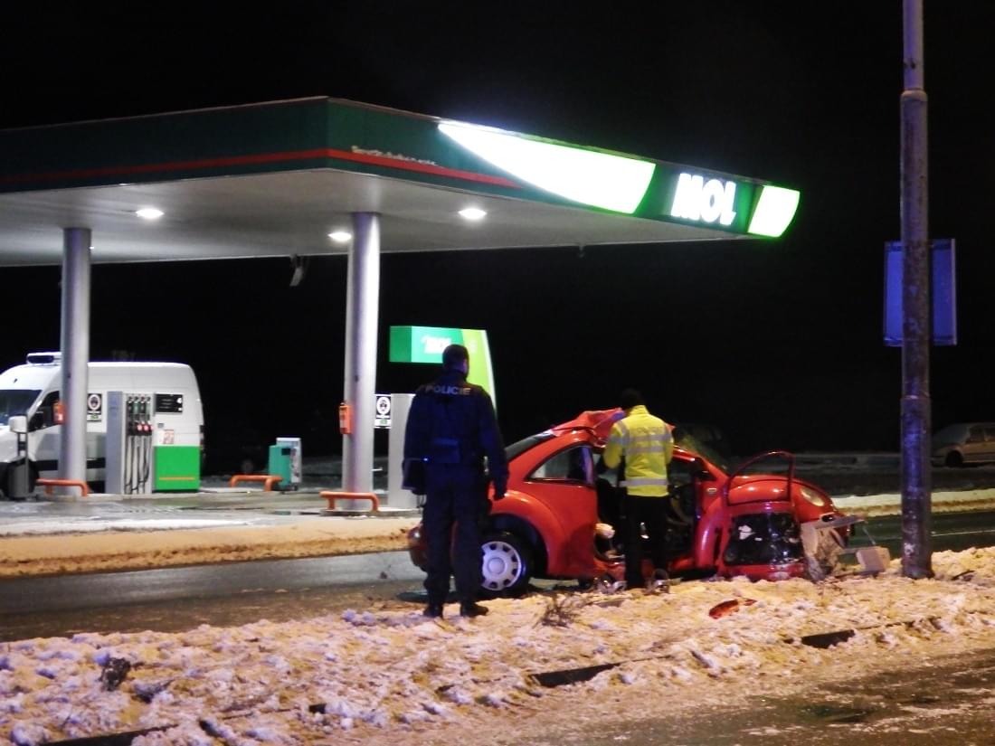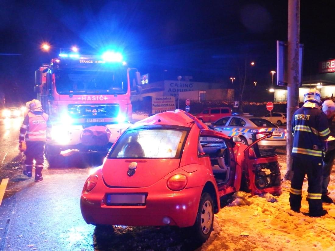 Dnes po osmé hodině večer došlo na Rokycanské třídě na výjezdu z Plzně k havárii, při které mladá řidička dle všeho na silně namrzlé vozovce nezvládla řízení a s vozem Volkswagen Beetle vyjela na středový dělící pás, kde se pravým bokem vozu střetla se sloupem lampy veřejného osvětlení.