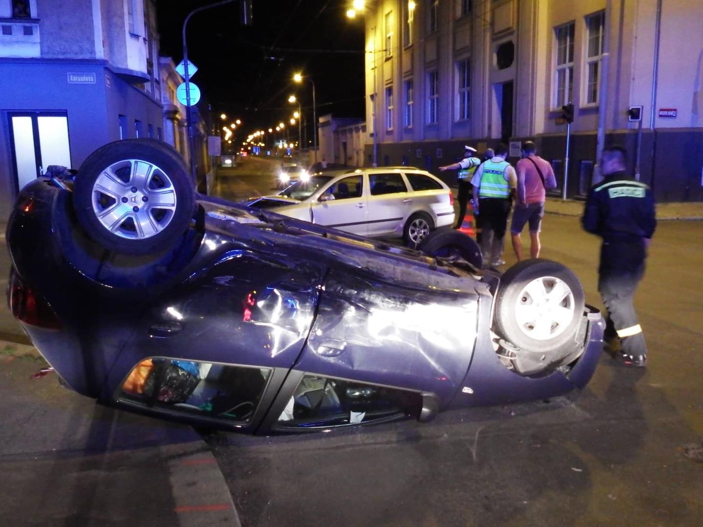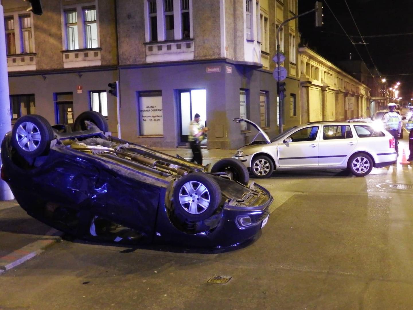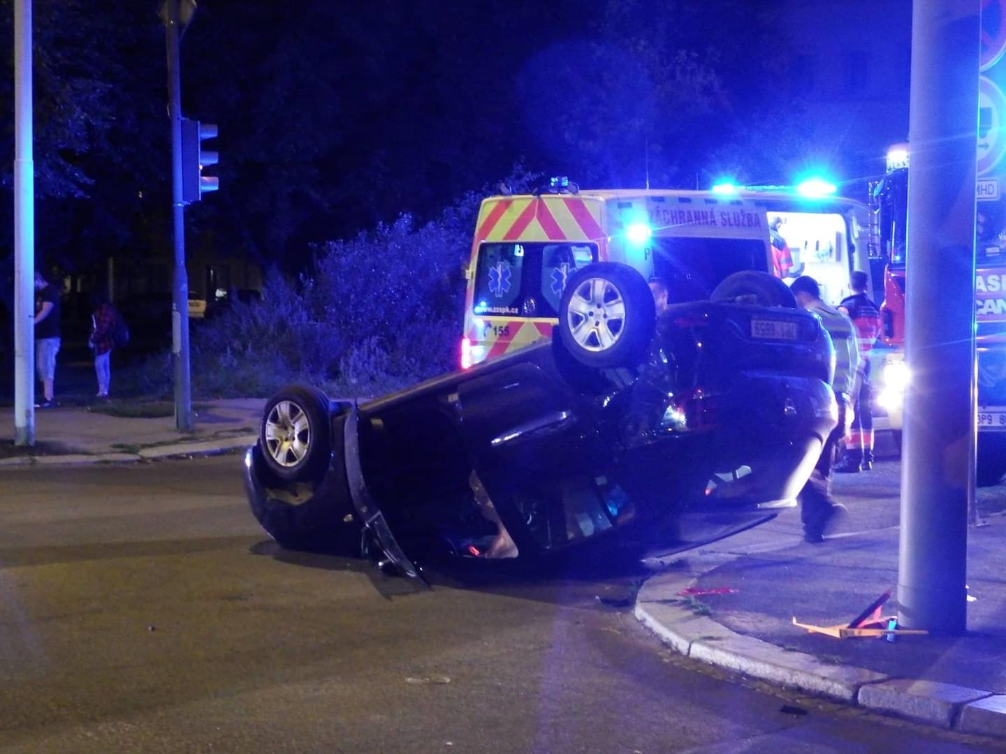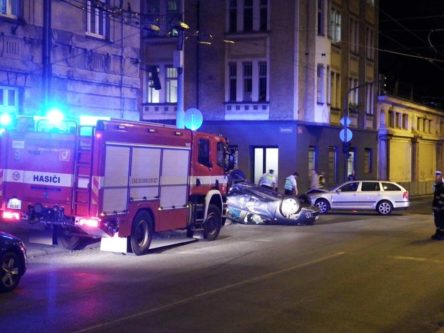 osobních vozů, kdy po střetu zůstal jeden vůz převrácený