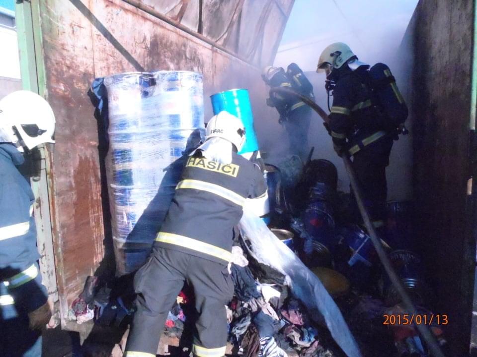 V Plzni Koterově hasiči z PS Slovany zlikvidovali požár velkokapacitního kontejneru na tříděný odpad - uvnitř použitý sorbent s ropnými látkami. Jeden proud hasiči použili k samotné likvidaci požáru, druhým dohašovali vynesené předměty. K usměrnění kouře použili přetlakovou ventilaci. Požár se obešel beze škod.