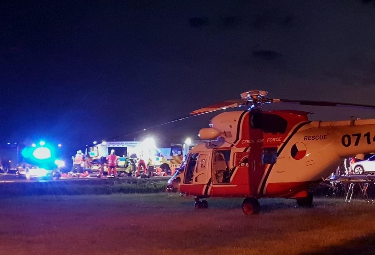 21,45 "První dva pacienti jsou bohužel děti ve věku přibližně 8 let. U jednoho z nich bylo nutné zajistit dýchací cesty a připojit jej na umělou plicní ventilaci a to pro závažné poranění hlavy. Druhé dítě se středně těžkým poraněním dýchá samo. Obě děti letí vrtulníkem na emergency do Fakultní nemocnice Plzeň.