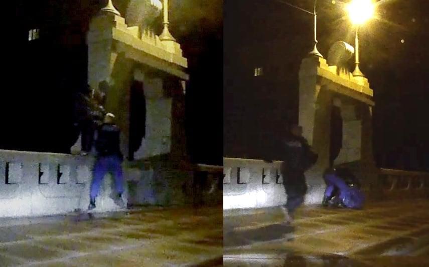 Hlídka využila svých zkušeností a zaujala postavení. Jeden ze strážníků se nepozorovaně přiblížil k muži zezadu a strhl ho za oděv z betonového zábradlí na chodník, druhý strážník mu ihned přispěchal na pomoc.