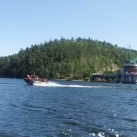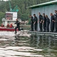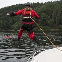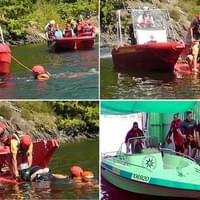Zde naskákali do vodyfiguranti, předstírající topící se osobya čluny se od figurantů vzdálily k bóji, kde se bleskurychle otočily a jely do akce osobám ve vodě na pomoc.