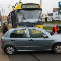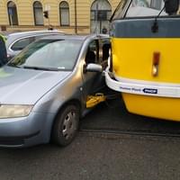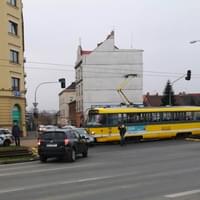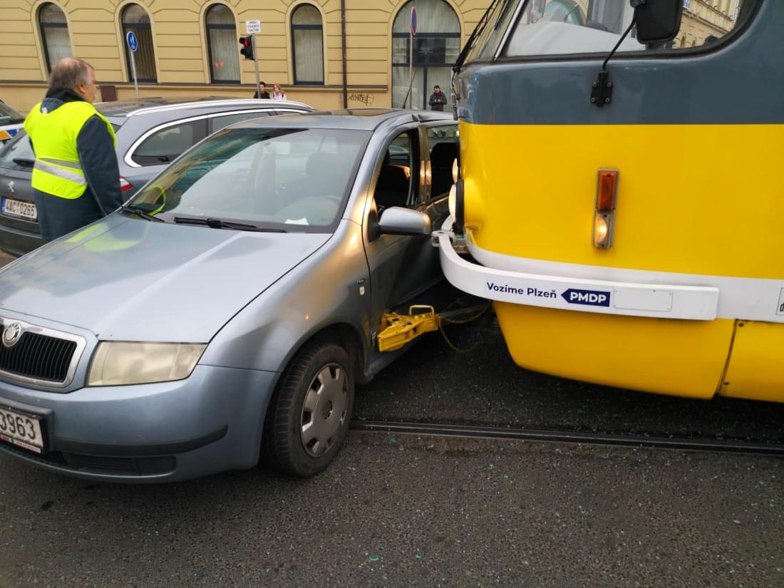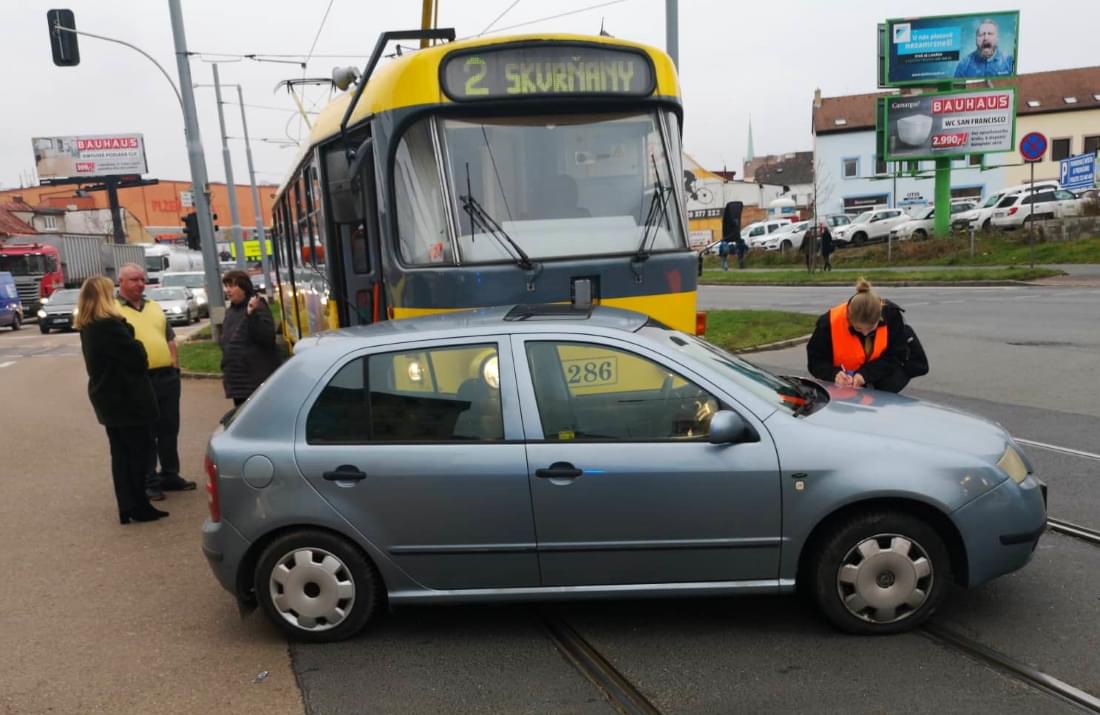 Ke střetu osobního vozu Škoda s tramvají linky číslo 2 došlo dnes v půl třetí odpoledne na křižovatce Skvrňanské a Kalikovy ulice v Plzni.