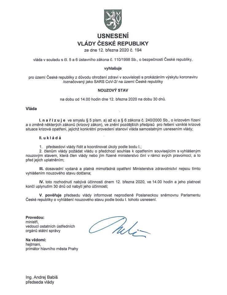 V souladu s čl. 5 a 6 ústavního zákona č. 110/1998 Sb., o bezpečnosti České republiky, vláda vyhlašuje pro území ČR z důvodu ohrožení zdraví v souvislosti s prokázáním výskytu koronaviru SARS CoV-2 nouzový stav od 14.00 hodin dne 12. března 2020 na dobu 30 dnů.