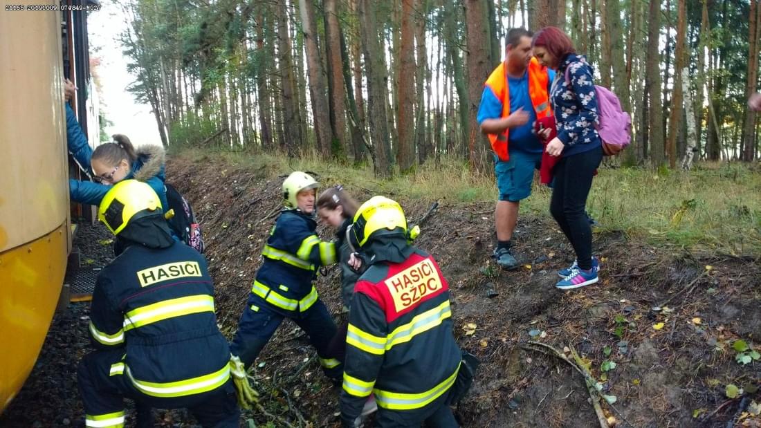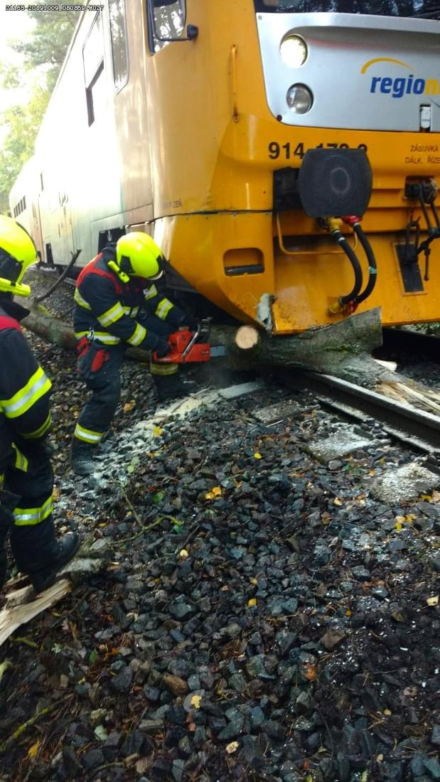 Hasiči cestující evakuovali do přistaveného náhradního vlaku a poté padlý strom odstranili pomocí motorových pil.