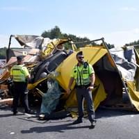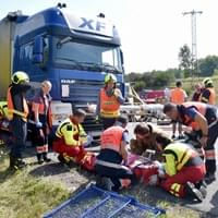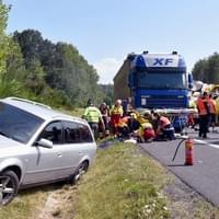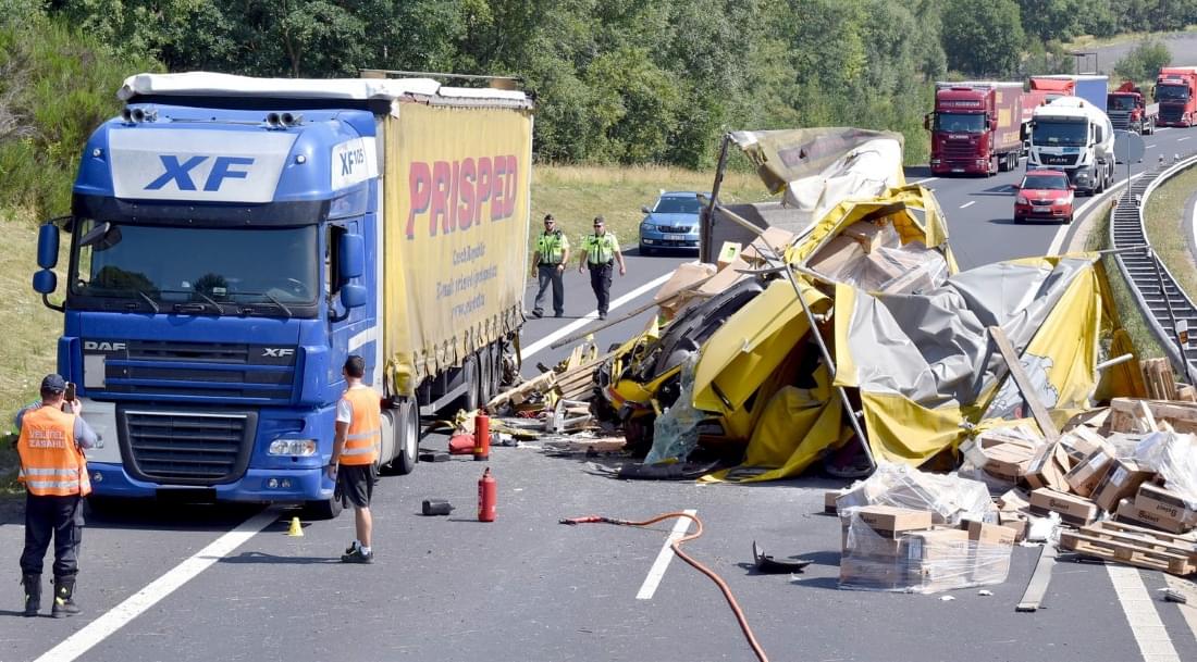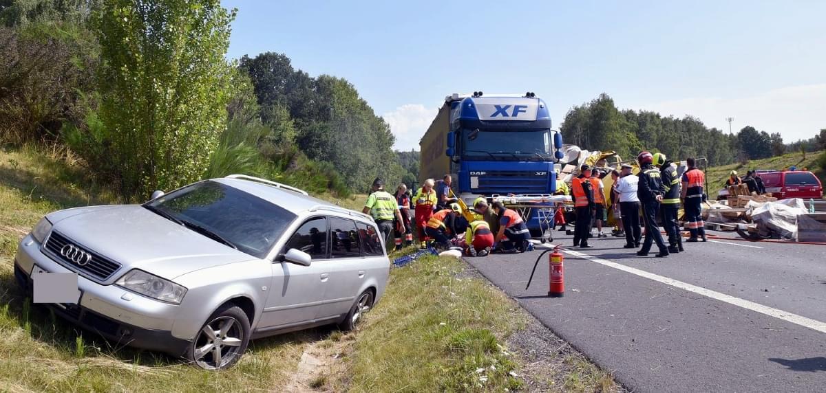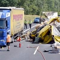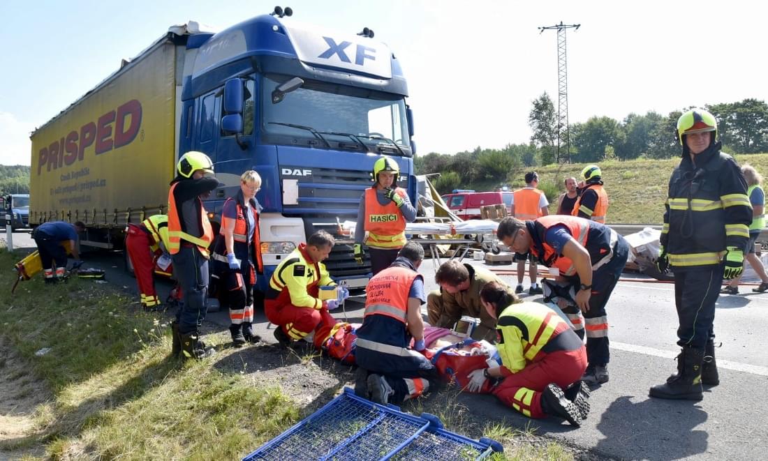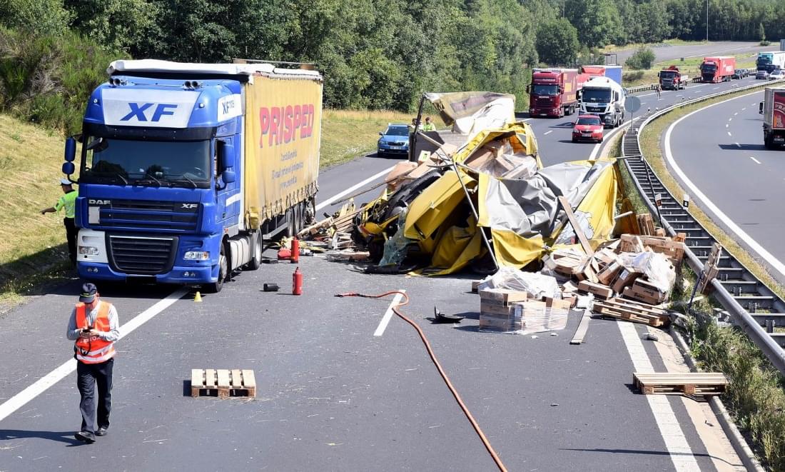 Řidič kamionu byl nezraněný, stejně tak posádka osobního auta, které se vyhýbalo nehodě a skončilo v náspu podél silnice.