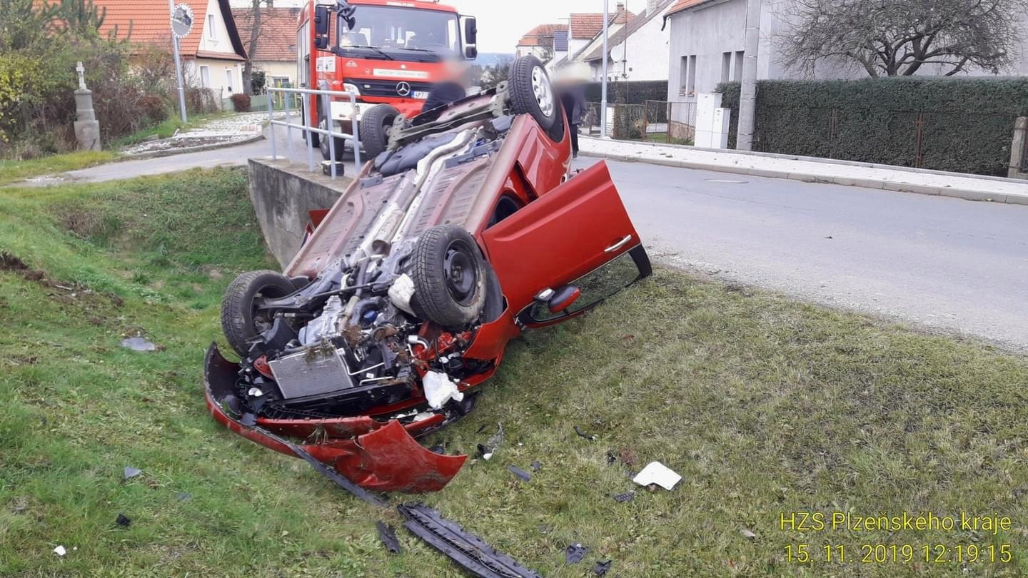 Dnes těsně po poledni došlo v Přehýšově k havárii, během níž skončilo osobní vozidlo převrácené na střeše mimo komunikaci. V Citroenu C3, který jel směrem na Kotovice, cestovaly dvě ženy.