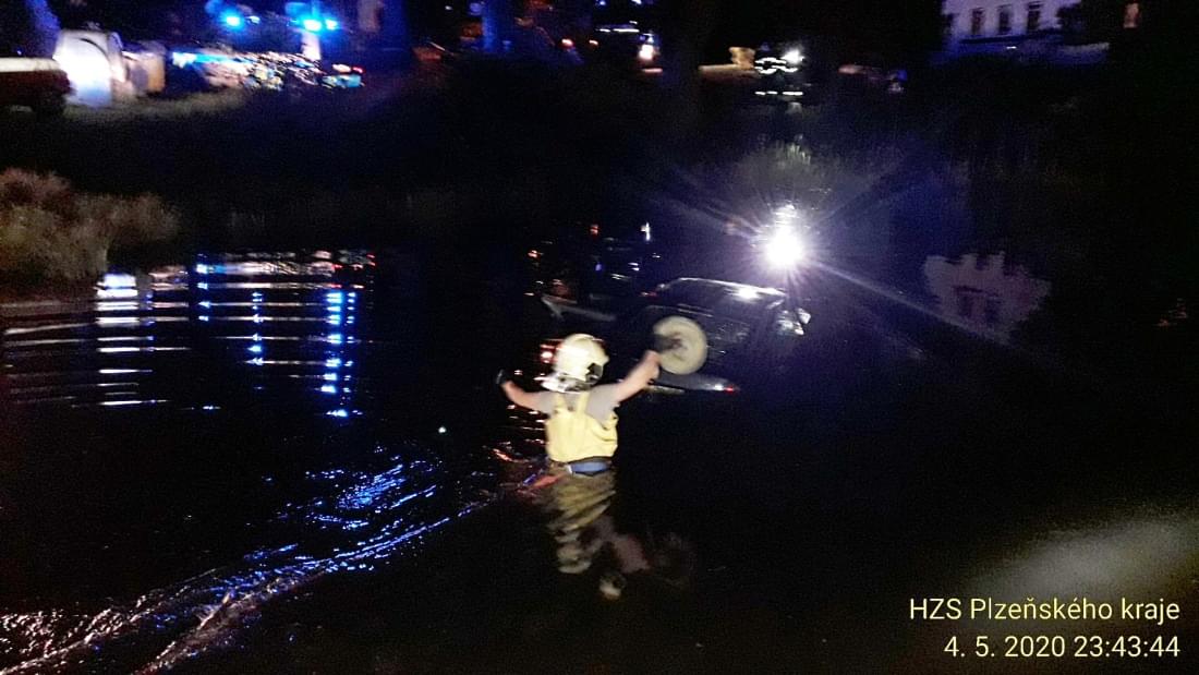 Od včerejšího dne to není jediný výjezd hasičů, při kterém museli vyprošťovat auto z vody. Kolem osmé hodiny ráno vyjížděli na Zbirožsko, kde museli terénní automobil vylovit z rybích sádek: