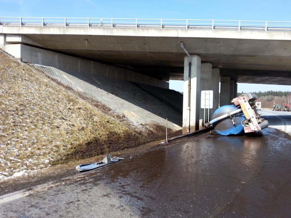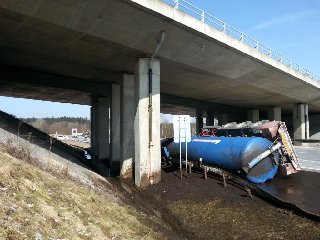 "Ve směru od dálnice D5 jel s nákladní soupravou 27letý řidič. Ten při odbočování z dálničního přivaděče vpravo ve směru na Tachov nepřizpůsobil rychlost jízdy vozidla a přepravovanému nákladu, v důsledku toho došlo k destabilizaci přívěsu s cisternou, ve které se nacházely exkrementy. Následně se pod váhou nákladu přívěs od tahače zcela utrhl a převrátil se v protisměru na levý bok. Při tom byla poškozena kovová svodidla i živičný povrch komunikace, zároveň došlo k úniku přepravovaného nákladu a provozních kapalin. Celkovou vzniklou škodu při dopravní nehodě policisté odhadli kolem 100 000 korun," uvedla k havárii tisková mluvčí policie.