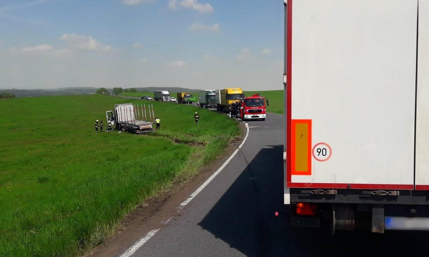Dnes před polednem došlo na Tachovsku na silnici mezi Olešnou a Vidicemi ke střetu dvou nákladních automobilů, po kterém jeden z nich, určený pro přepravu klád, vyjel ze silnice do pole.