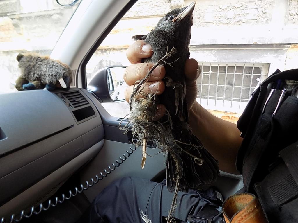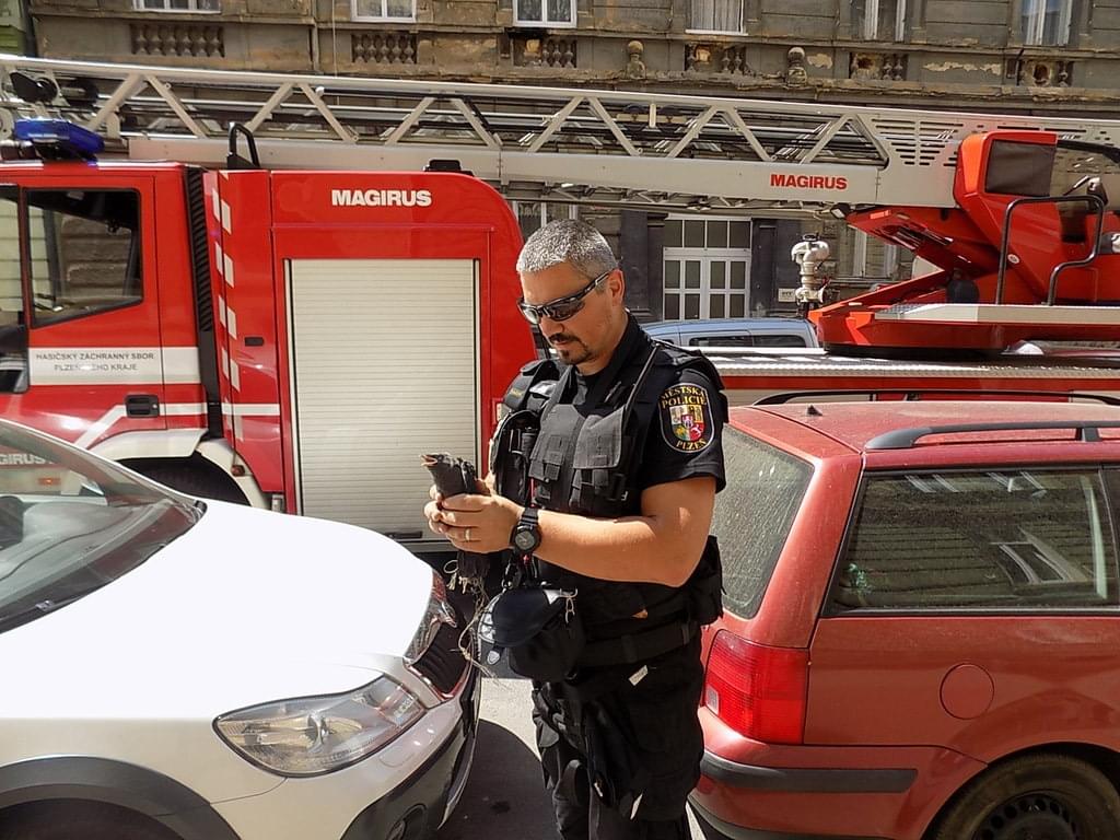 Včera v odpoledních hodinách zachraňovali strážníci spolu s přivolanou jednotkou hasičského záchranného sboru uvízlou kavku pod římsou čtyřpatrového domu ve Skrétově ulici, která byla zamotána do změti provazů.Vzhledem ke špatné přístupnosti musel být použit automobilový žebřík. Následně byl mladý opeřenec předán do záchranné stanice živočichů, kde se o něj postarali.