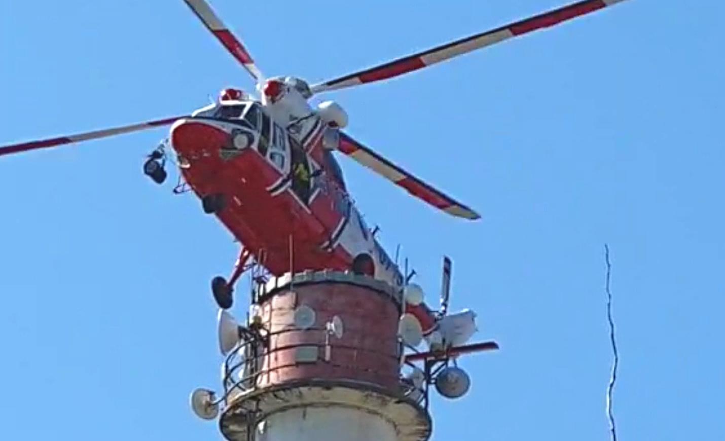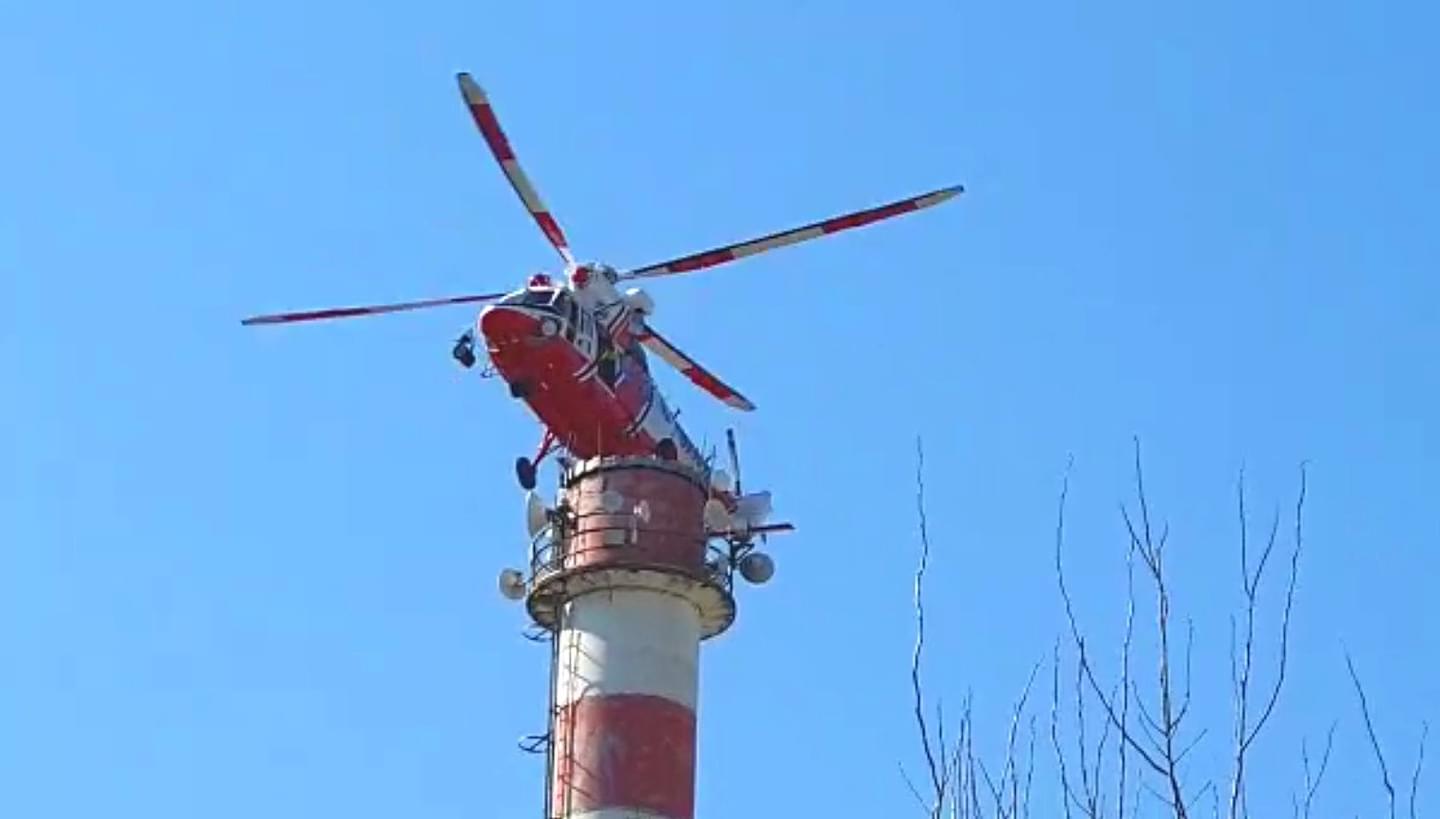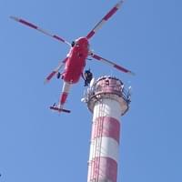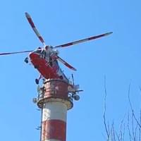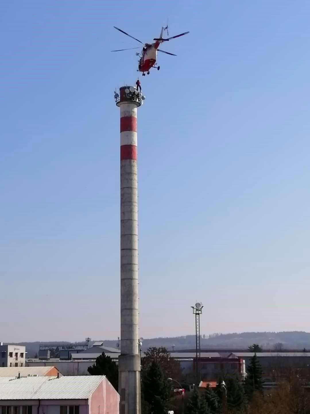Pilot vrtulníku na místě předvedl opravdové mistrovství v ovládání stroje, když se nad vrcholkem komína vznášel tak nízko, že lezec jištěný lanem mohl v podstatě seskočit přímo na komín.