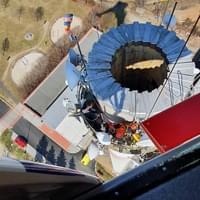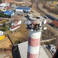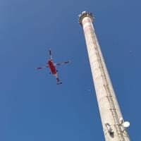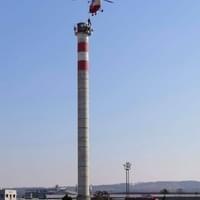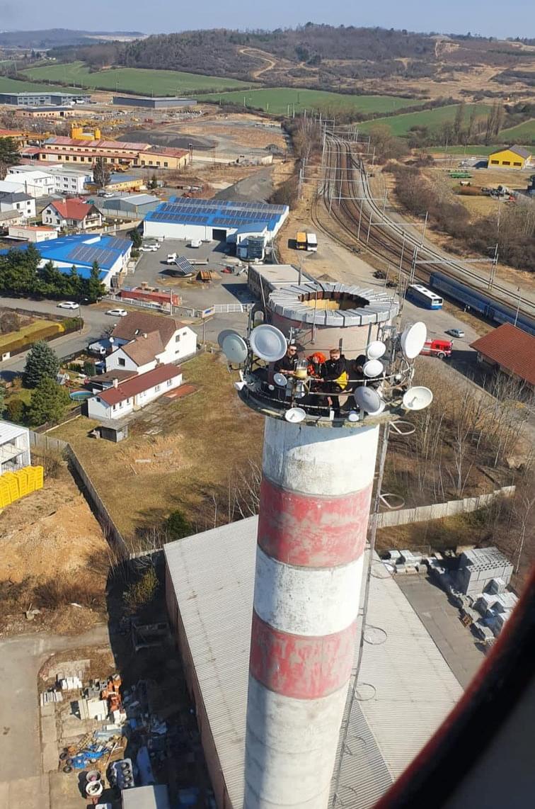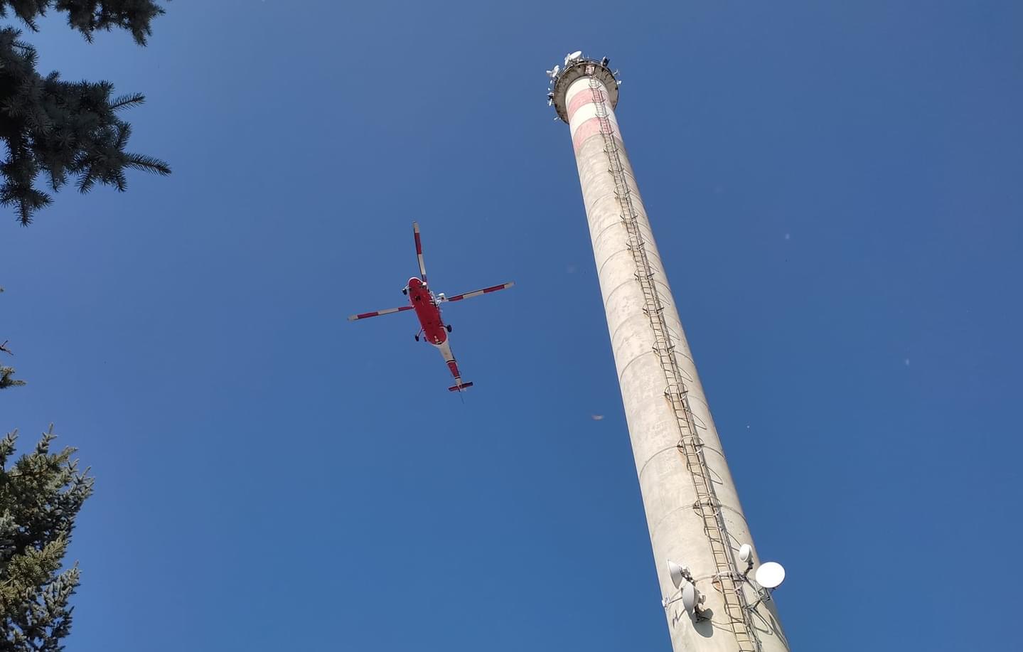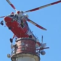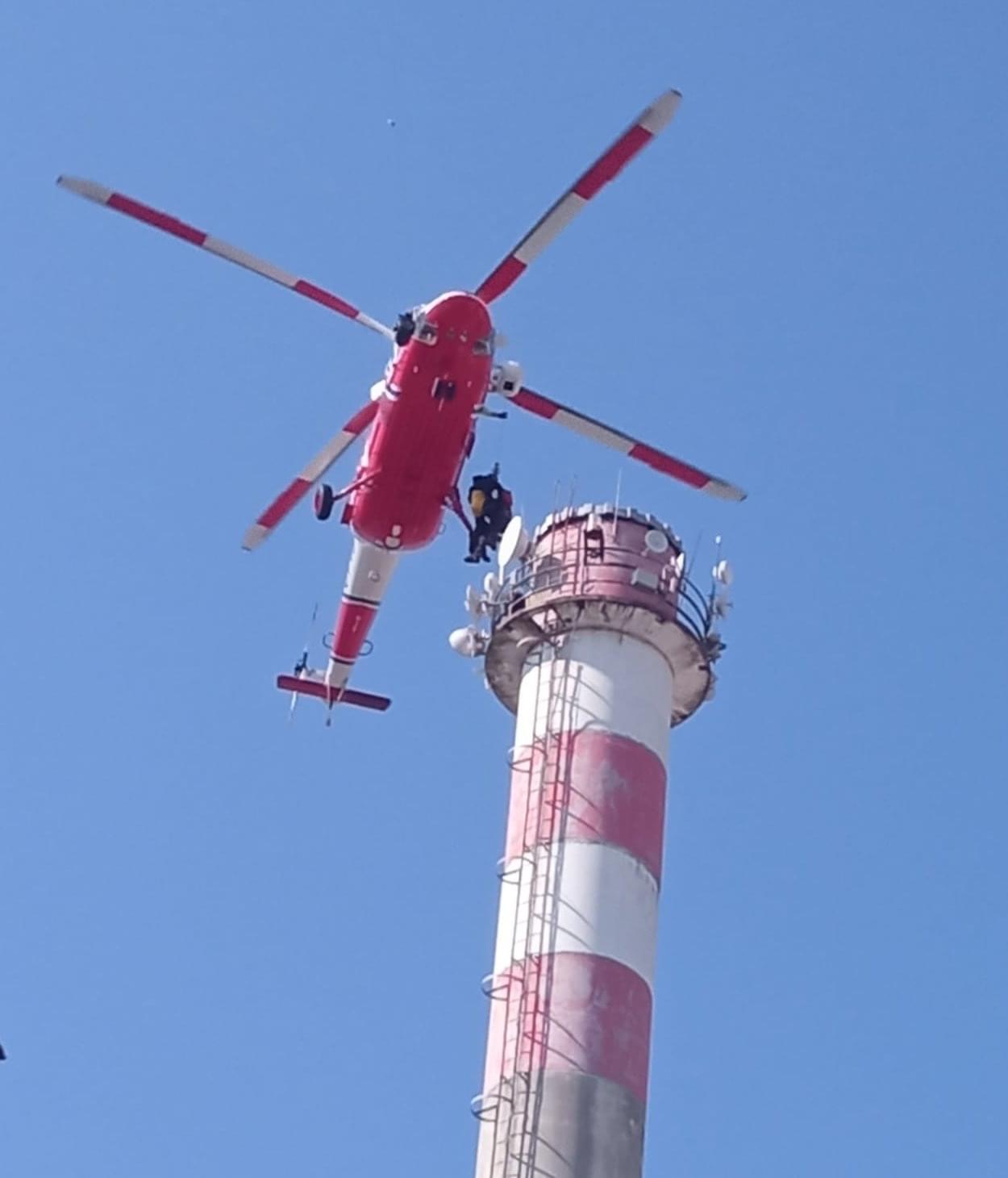 Pilot vrtulníku na místě předvedl opravdové mistrovství v ovládání stroje, když se nad vrcholkem komína vznášel tak nízko, že lezec jištěný lanem mohl v podstatě seskočit přímo na komín.