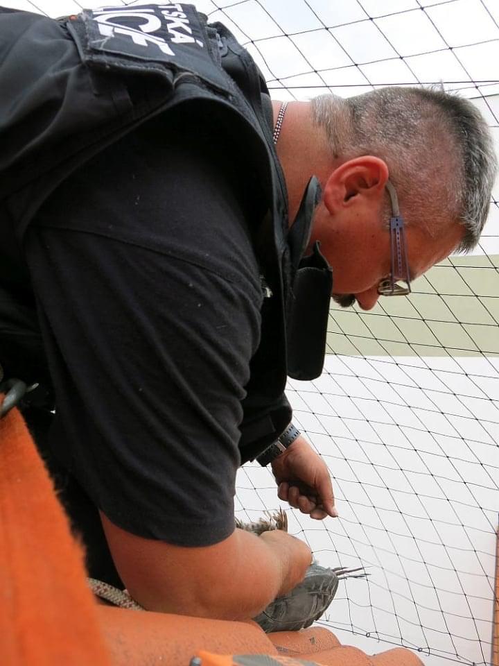 Čtvrtky odpoledne hlídám, mám malou a tentokrát to s ní na šikmé střeše opravdu nezvládnu. Žádám tedy o pomoc kolegy z odchytové skupiny Městské policie Plzeň a zhruba za půl hodiny se potkáváme před budovou. Pán z úřadu nás vede na střechu a ukazuje poštolčího samečka, zamotaného do ochranné sítě.