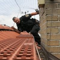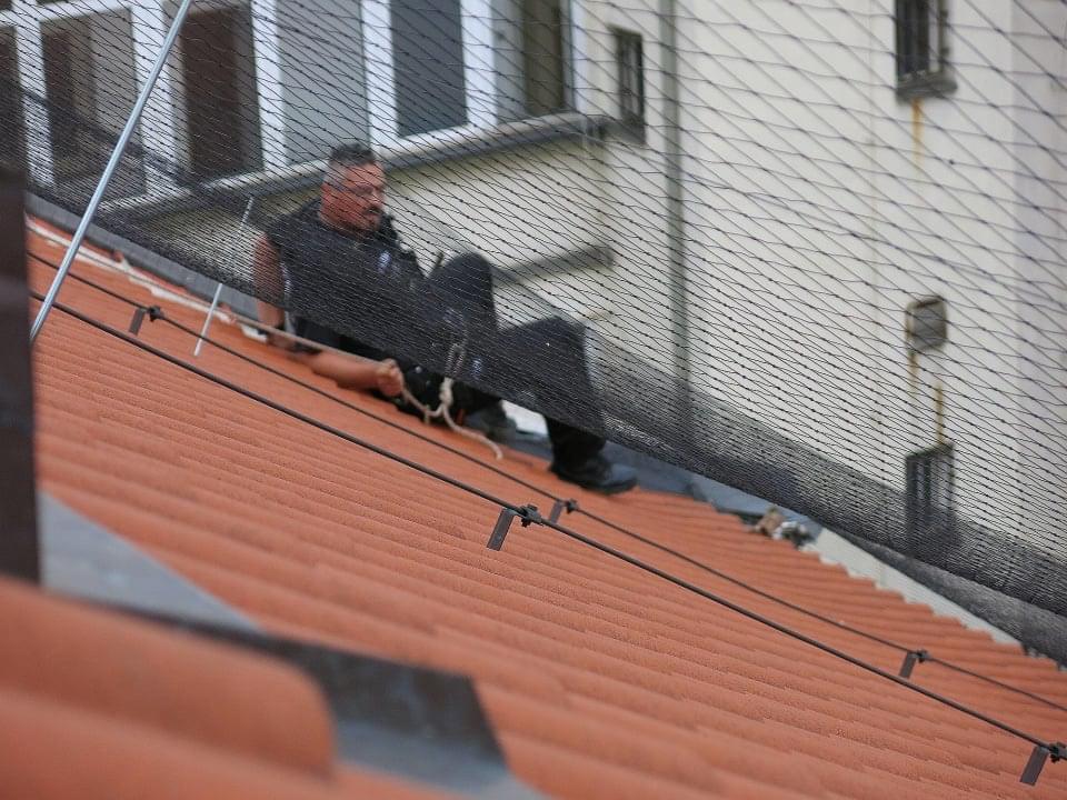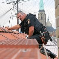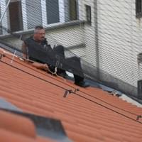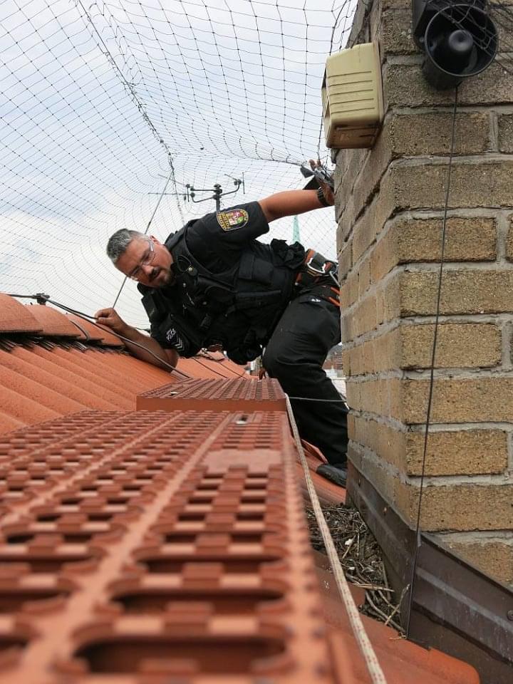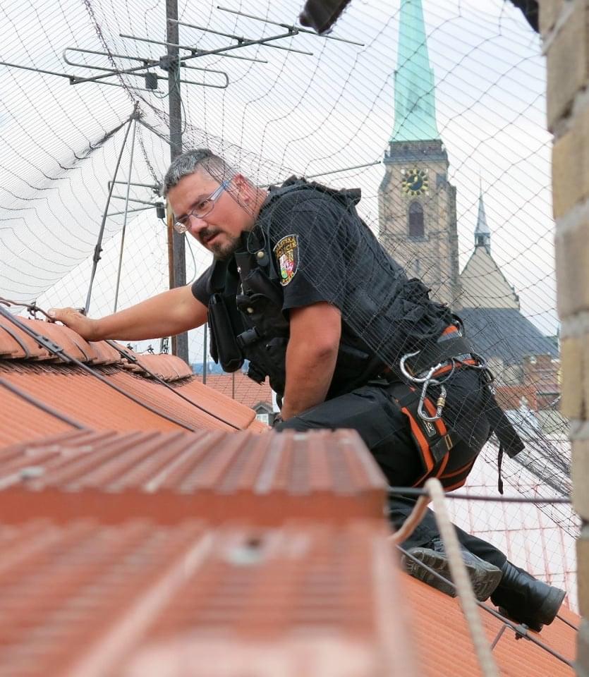 Jde to špatně, strážníci na sebe nevidí, střecha je dosti šikmá a mezera mezi střešní krytinou a ochranou sítí jenom několik centimetrů. Mimo jiné se není čeho chytit a hromosvod i komín včetně stupaček jsou od zamotané poštolky dost daleko. Přesněji řečeno, kdyby se kolega Kokoška po střeše sklouzl, tak by zcela bezpečně zmizel pod okapem, zavěšený na laně v prostoru před okny kanceláří.