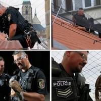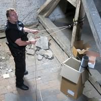 Strážník Petr Kokoška se obléká do jistícího postroje a leze po žebříku do vikýře, kolega Zdeněk Petrovic ho jistí z půdy a povoluje či přitahuje jistící lano.