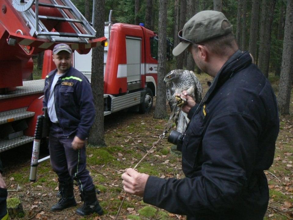 V sobotu po obědě vyráželi hasiči ze Staňkova k neobvyklé záchranné akci. „Dravec byl zachycen za poutko a kus provazu za větev borovice, ve výšce asi 15 metrů, v lese u penzionu Zelený Háj u Krchleb. Hasiči ustavili výškovou techniku a ve spolupráci s členy Záchranné stanice zvířat dravce zachránili,“ popsala nám záchrannou akci tisková mluvčí hasičů.