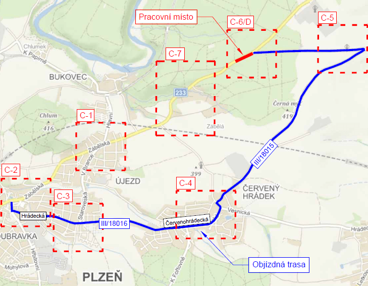 - Etapa A směr Bory: ulice Dobrovského - Zikmunda Wintra - 27.7. - 12.8.2022 - v tomto úseku dojde k uzavření pravého jízdního pruhu přidruženého k chodníku, a to v úseku č. par. 7309/1 až po ulici Z. Wintra