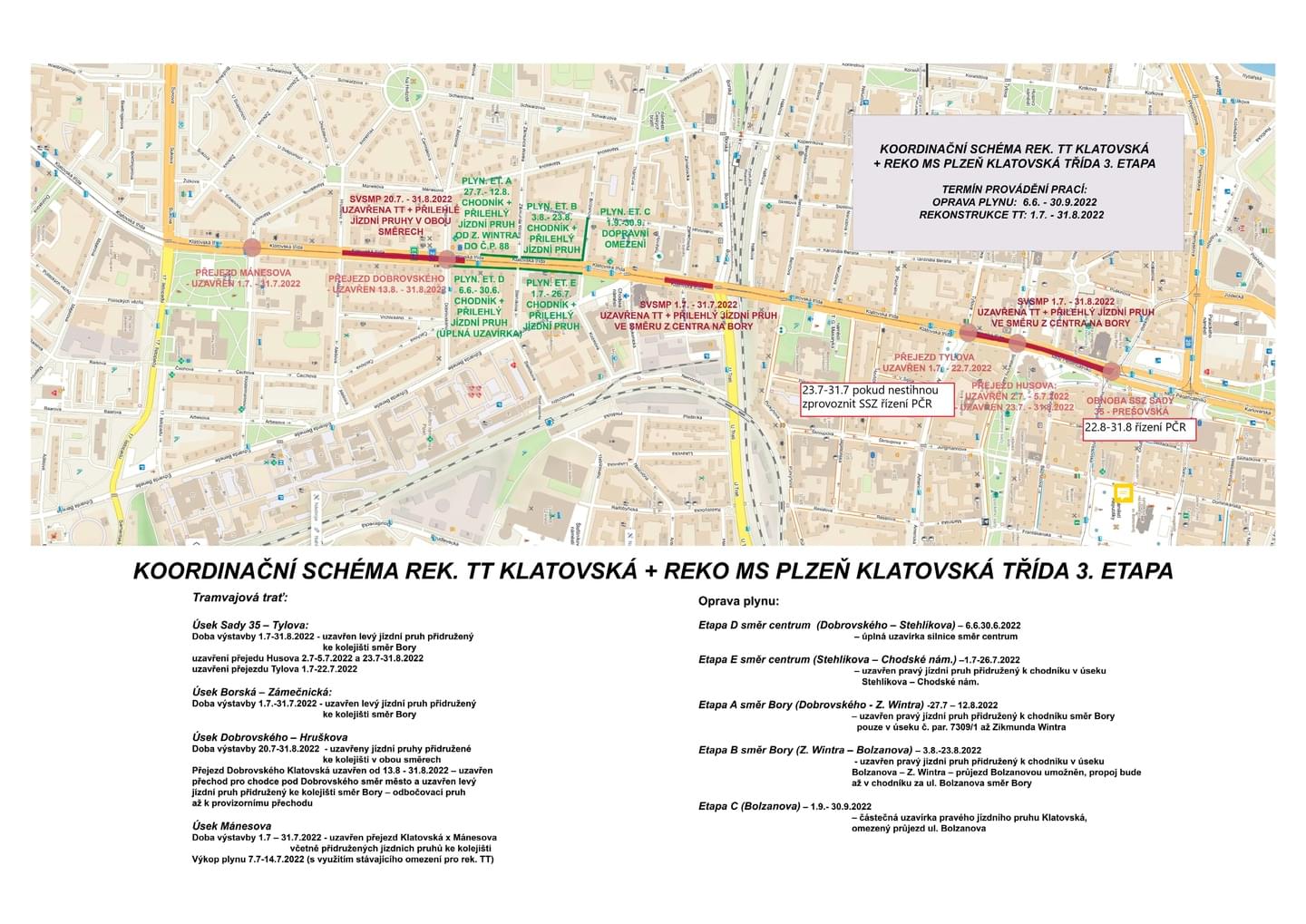 V úseku od ulice Sady 35 po ulici Tylova dojde od 1. července do 31. července k uzavření levého jízdního pruhu přidruženého ke kolejišti pro směr Bory.Od 2. července do 5. července a od 23. července do 31. července bude uzavřen průjezd přes Klatovskou z Husovy ulice, od 2. července do 23. července bude uzavřen průjezd přes Klatovskou z Tylovy ulice.