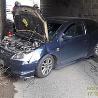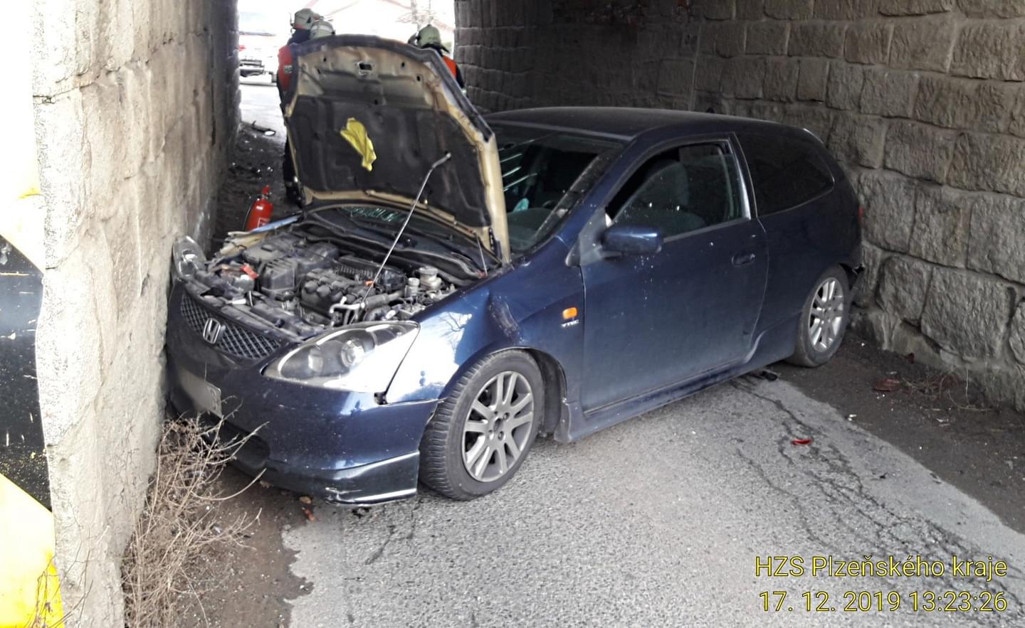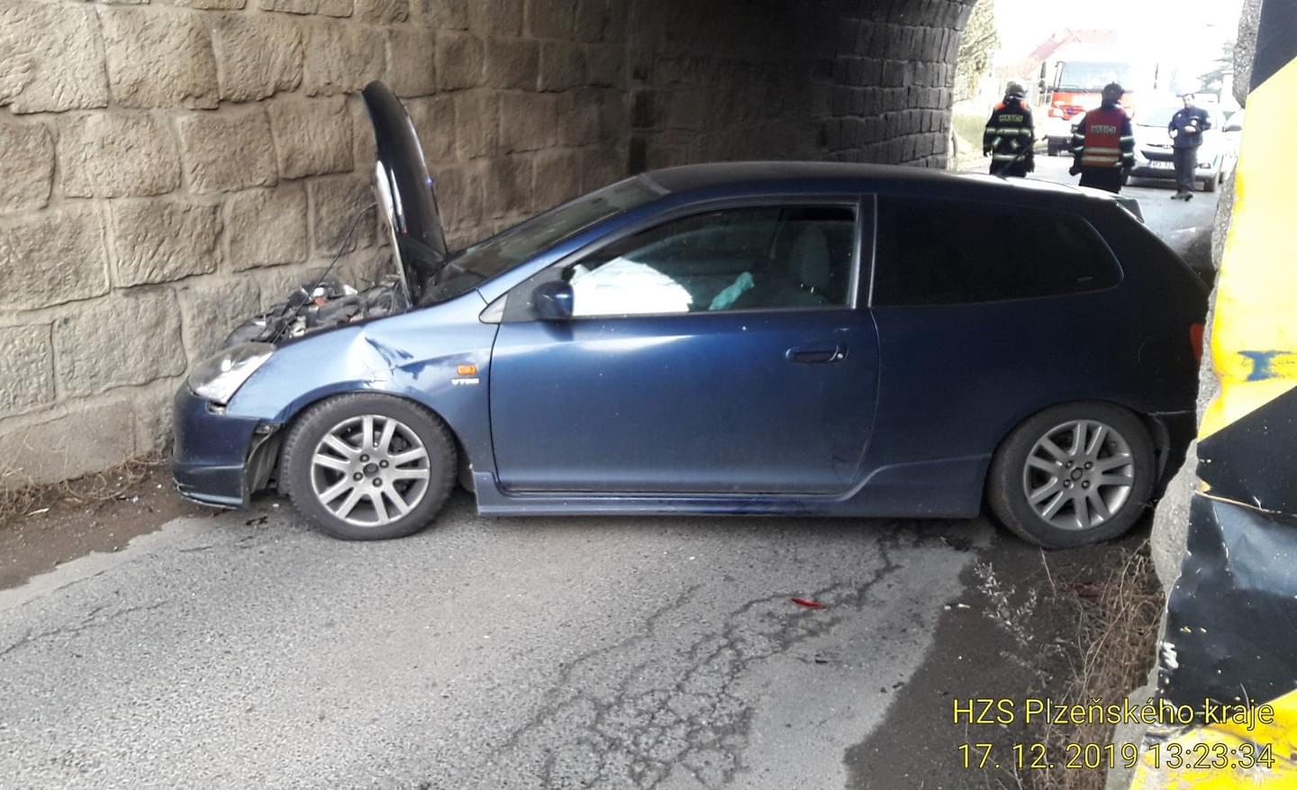 Dnes lehce po třinácté hodině jel řidič s vozidlem Honda Civic směrem z Blovic na Seč, podle policie se nevěnoval řízení nebo nepřizpůsobil rychlost a v Blovicích v Setecké ulici škrtl o stěnu železničního viaduktu. Náraz vozidlo uvedl do smyku a to se zaklínilo pod viaduktem, tak, že ho museli přijet vyprostit hasiči ve spolupráci s odtahovou službou.