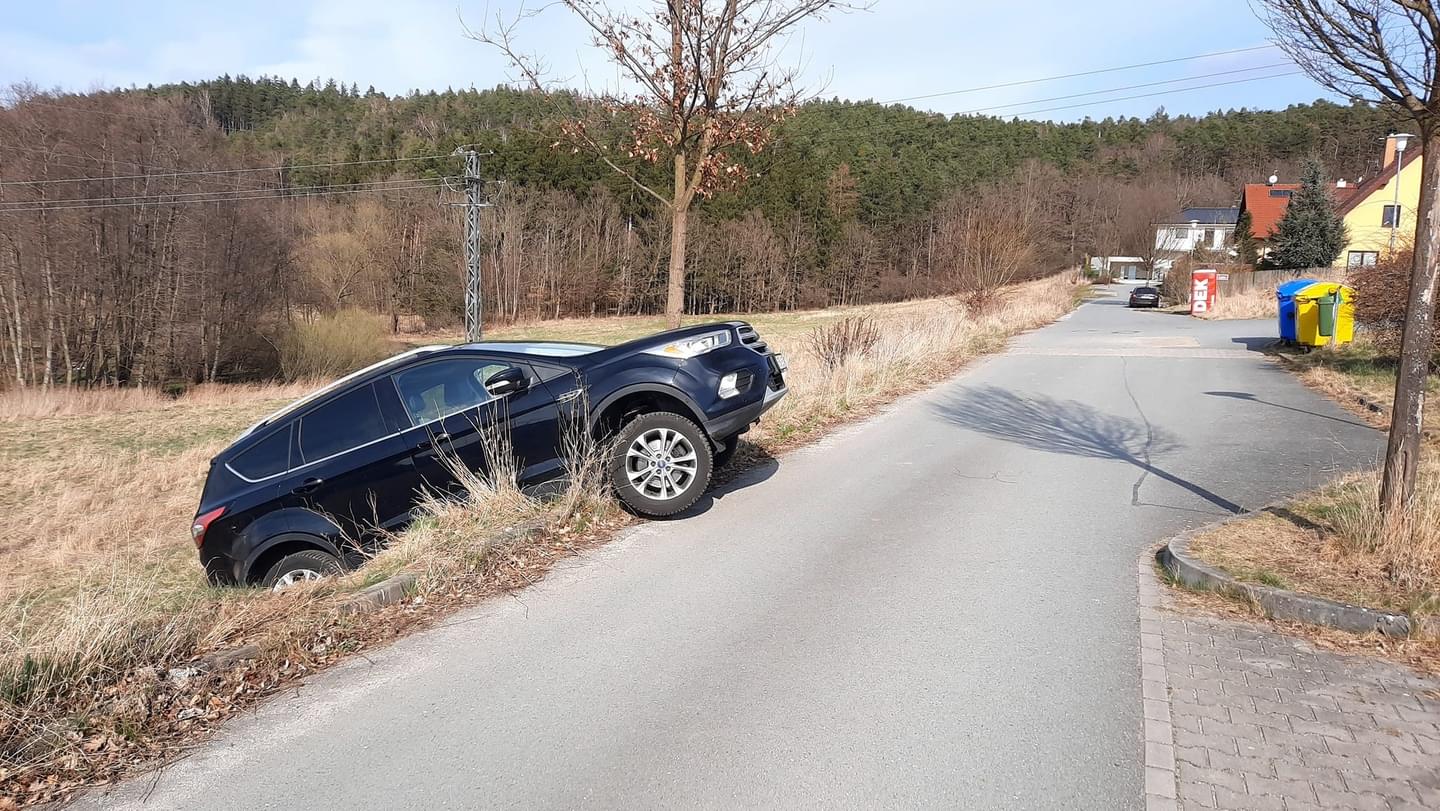 Obrovským ženiným štěstím byl ve stráni stojící stromek. O ten se totiž rozjíždějící auto zachytilo a zůstalo ve svahu pod silnicí viset.