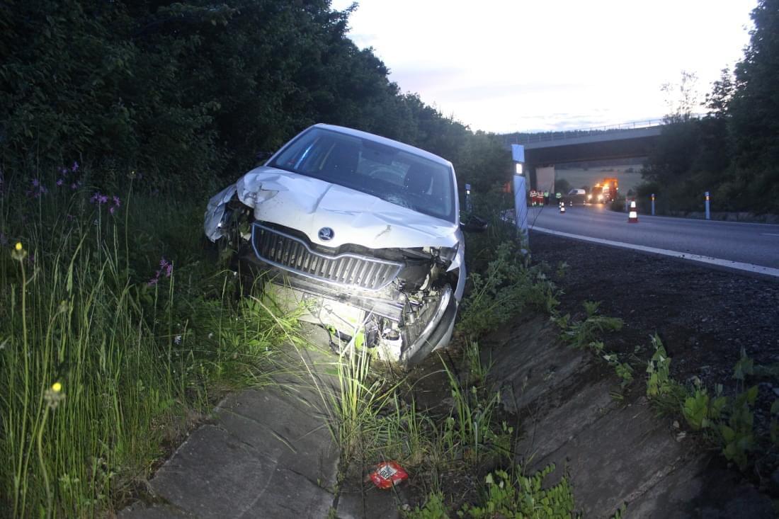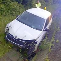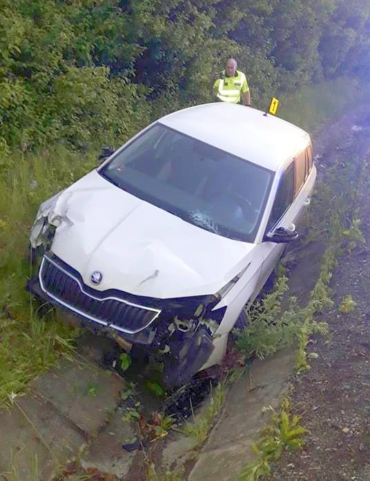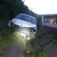 K další nehodě došlo v sobotu kolem deváté večer na nájezdu na dálnici D5 u Ejpovic ve směru od Plzně, kde řidič se Škodou Fabia nezvládl řízení a vyjel ze zatáčky, na asi třiceti metrech srazil několik dopravních značení s s vozem skončil zapasovaný v odvodňovacím příkopu. Řidič narozený v roce 1981 měl platný zákaz řízení.